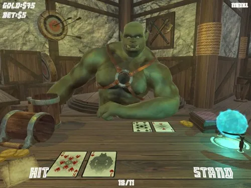Bara Blackjack - In a little medieval town, you meet a gorgeous orc blacksmith coated in fur and grease who invites you to a blackjack game. The dealer orb to your right is a magical device enabling more honest gambling with better odds and bonuses. Who knows what will happen next in the story? This twisted slab of meat may look cute, but make no mistake: it's here to stay. If you play your cards right, you'll have an experience like no other.