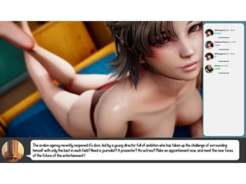 You play as Avar, an ambitious young man who inherits his uncle's celebrity agency. Arrogant and surly, Avar decides to cut ties with the agency's existing talents and instead focuses on advancing the careers of Morgane, a family friend turned reluctant girlfriend, his sister Anna, and childhood friend Elaine. Your goal is to grow the careers of your talents while managing your relationships with the three girls. Watch your talents perform in the various shows you choose for them., sneak into your girlfriend's Despot (discord) account to spy on her conversations, and upgrade your agency!